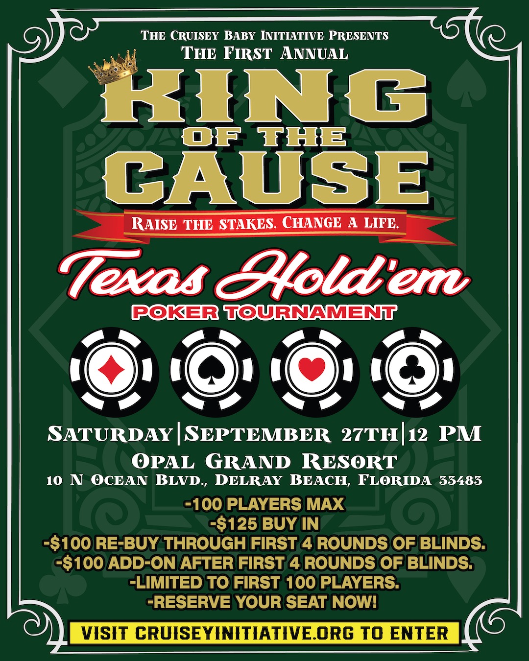 Held at the stunning Opal Grand Resort in Delray Beach, Florida, King of the Cause is a high-energy Texas Hold’em poker tournament bringing together players, supporters, and difference-makers to raise funds for life-changing support for those living with spinal cord injuries.